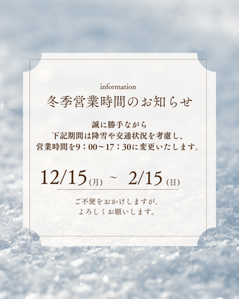 降雪シーズンに伴い、交通状況等を考慮し下記の期間中は冬季営業時間を以下の通り変更させていただきます。